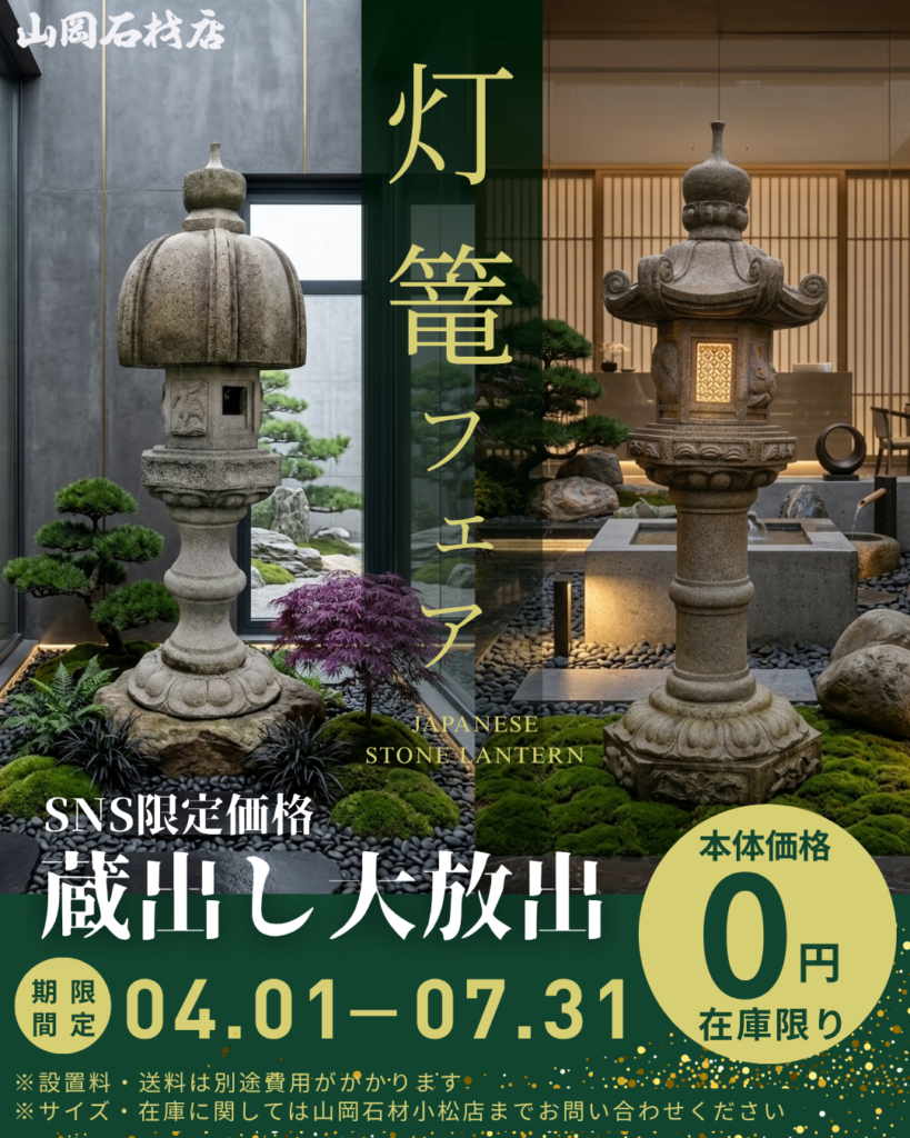 この度、より多くの方に石の温もりと日本のモダンを感じていただくため、展示品の石灯篭を【本体価格0円】にて、現品限りでお譲りします。※現地引渡しの場合のみ