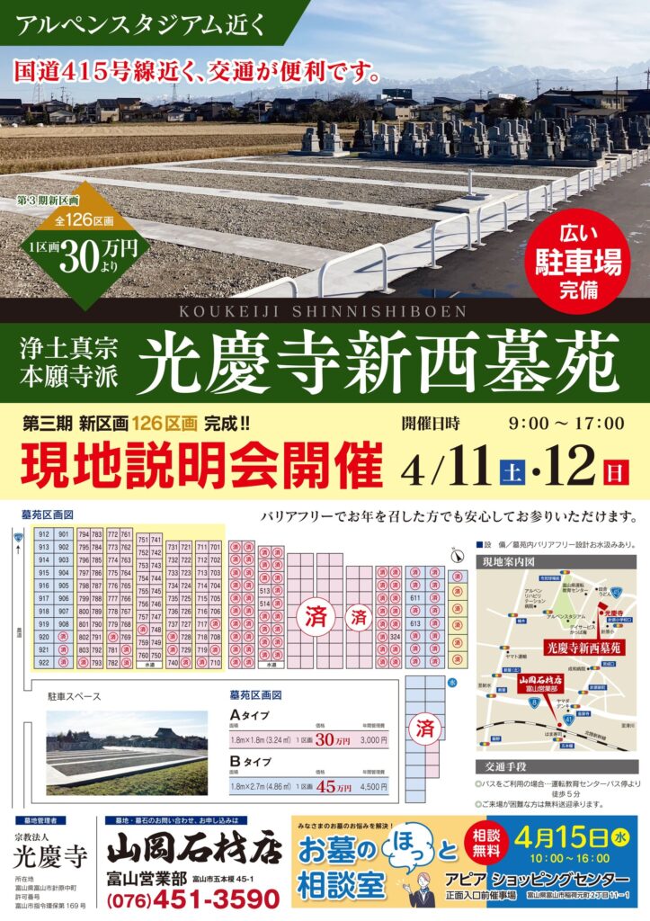 【4/11・12開催】光慶寺新西墓苑「第3期 新区画」現地説明会のお知らせ(富山店)