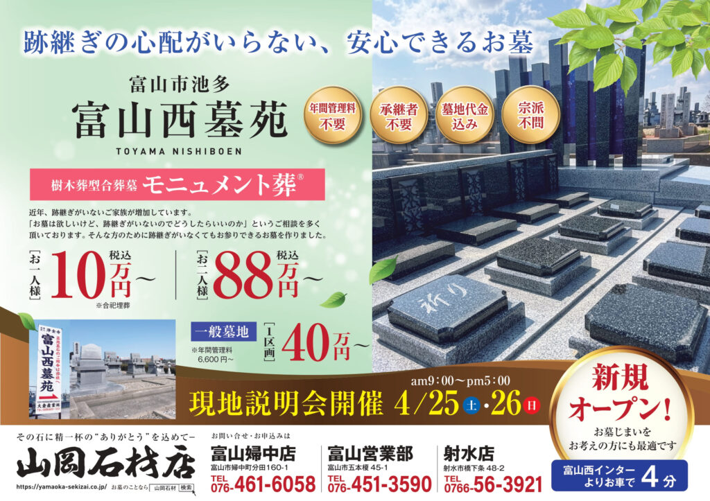 【現地説明会】富山西墓苑 4/25(土)~4/26(日)【樹木葬型 新規オープン】